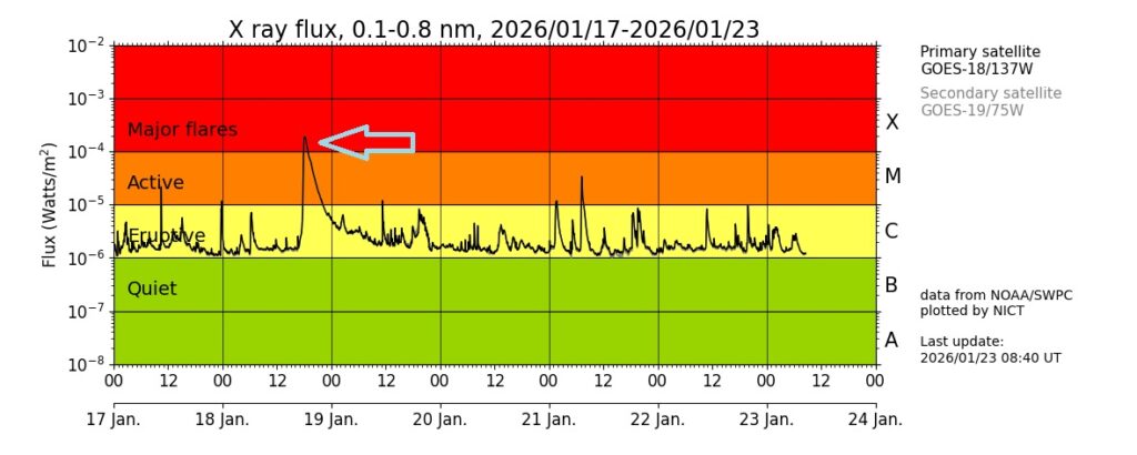 1/22/2026日に7MHzにて、久しぶりにJA6ETS(木村)さんとQSOが出来ました。先般の19日発生したFlareの影響での磁気嵐等があるか否かを確認するために7MHzをワッチしたのですが、木村さんを発見して交信スタートしましたが、終了時間内での激変は少なく無事に交信ができました。下画像は本日のものですが、それでもかなり激しく爆発しているように観えます。