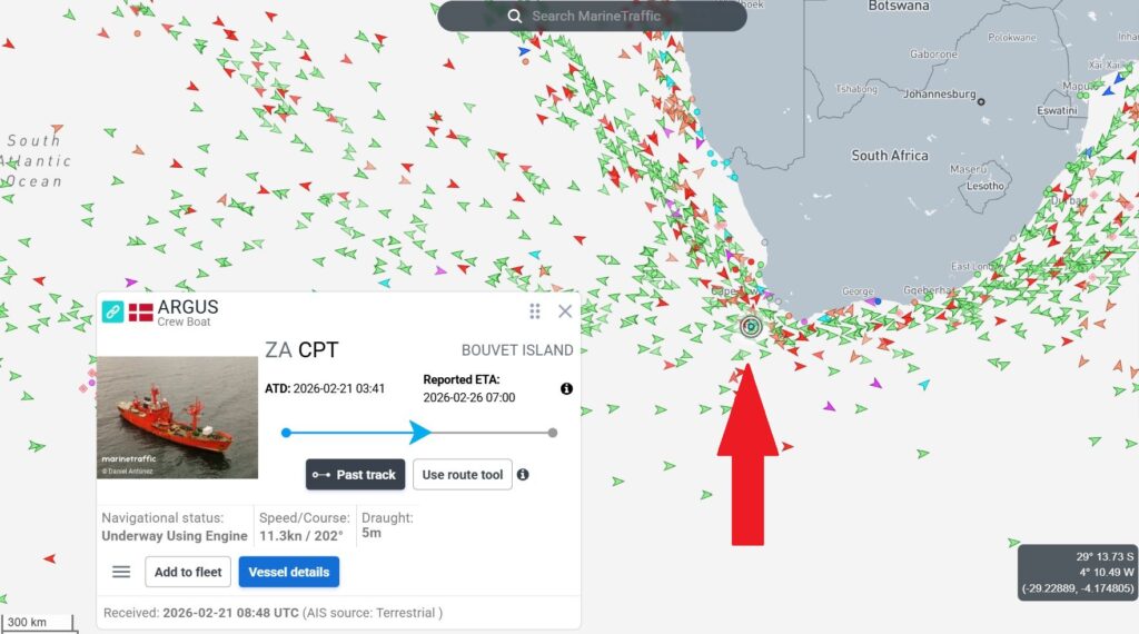 2/25/2026 08:40でのARGUS Ship Trackingを見るとどうもShip情報がUpdateされていないようです。ほぼ、昨日と同じPoditionにあるように見えています。